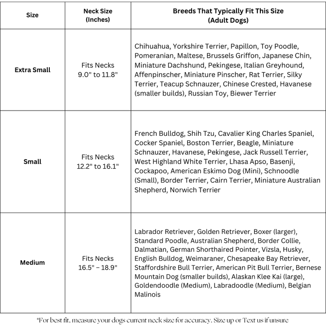 Use our simple sizing chart based on neck measurements. We included breed examples to make it even easier. Takes 30 seconds with any soft tape and you’ll know exactly what to order.💡