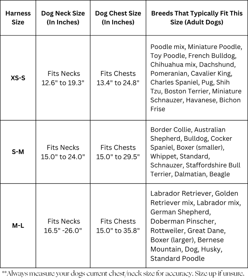 Use our simple sizing chart based on neck + chest measurements. We included breed examples to make it even easier. Takes 30 seconds with any soft tapeāand youāll know exactly what to order.š”