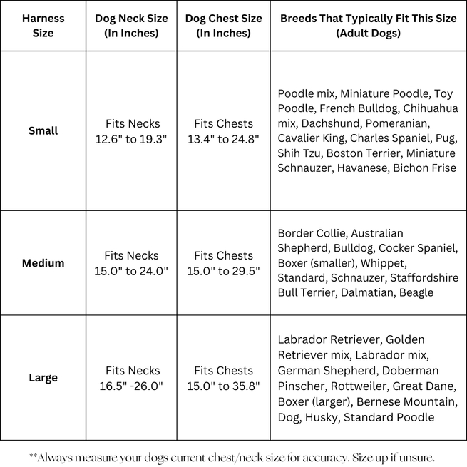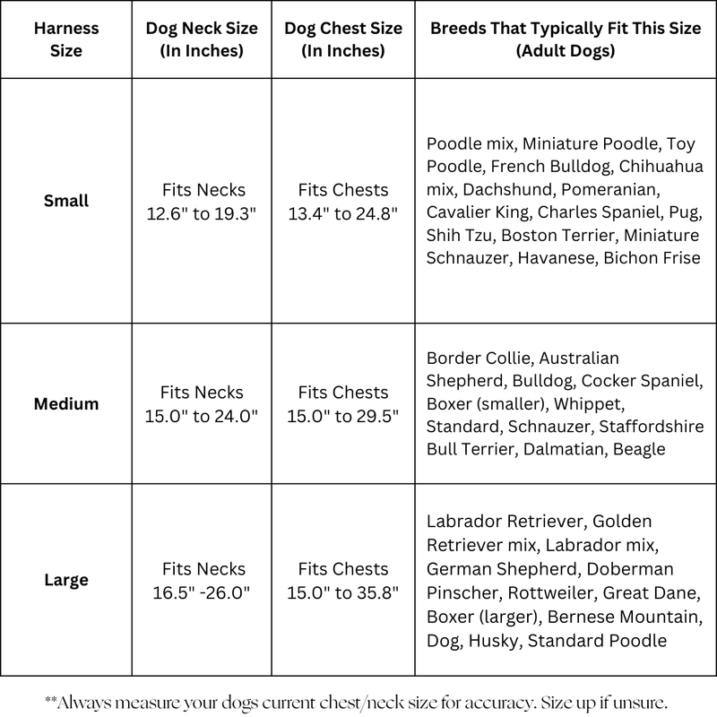 Use our simple sizing chart based on neck + chest measurements. We included breed examples to make it even easier. Takes 30 seconds with any soft tape—and you’ll know exactly what to order.💡