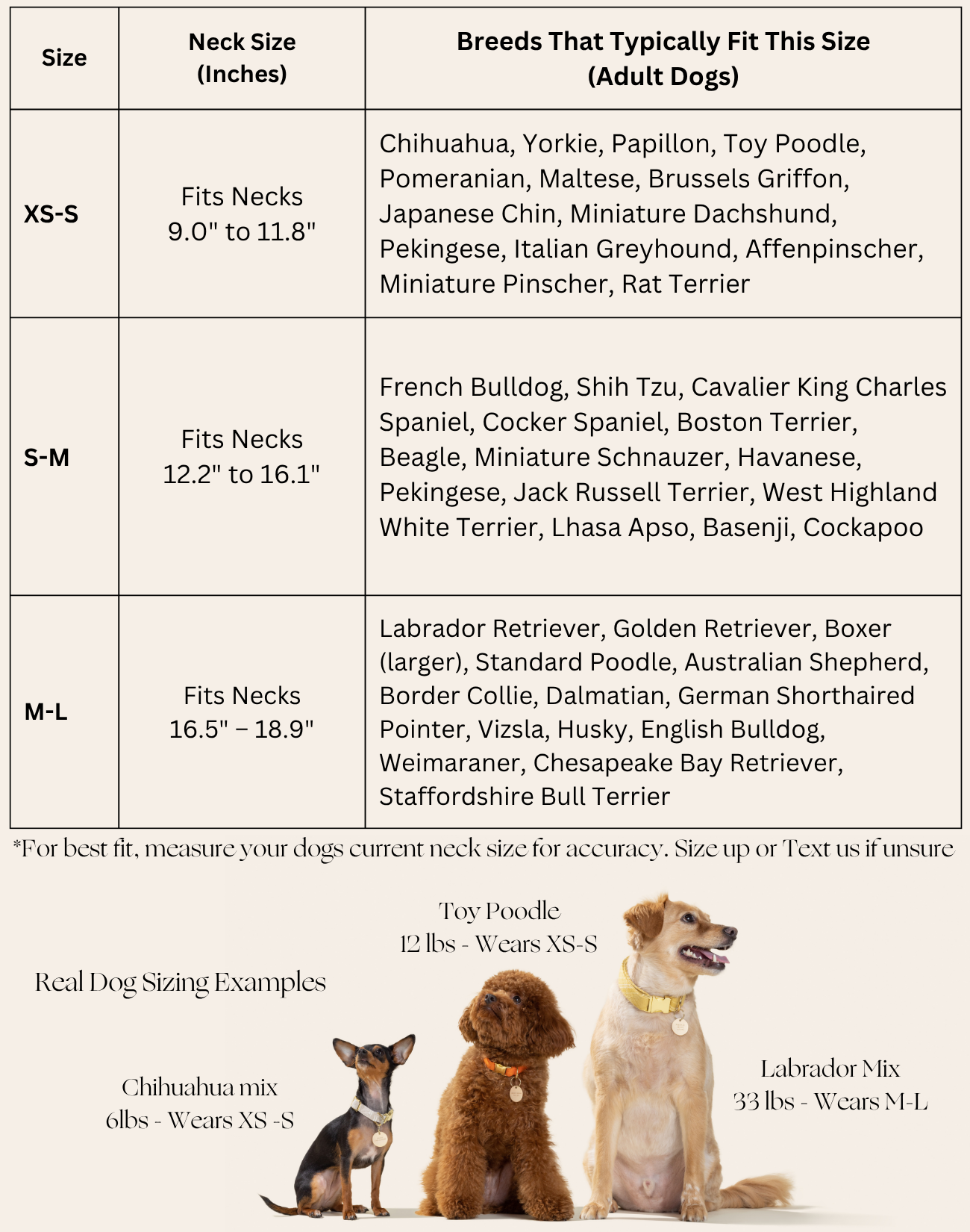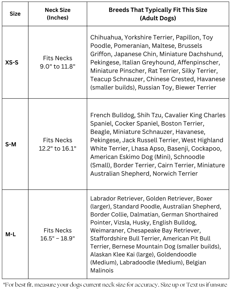 XS–S is perfect for toy breeds and puppies. S–M is great for most small/medium dogs like Frenchies or Cavapoos. M–L is ideal for larger dogs like Standard Poodles or Labs. Each collar is adjustable within its range for a just-right fit.